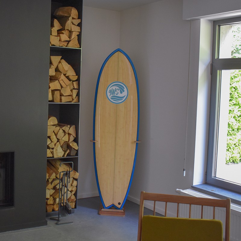 Natural wood surfboard stand. As useful as it is aesthetic to store your surfboard. Adjustable width with a compass.