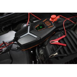 Le PROenerg HX8A permet de charger des batteries au plomb, scellées, Gel, AGM, LifePO4 allant de 2 à 160 AH en 12V et de 2 à 80 AH en 24V. Son microprocesseur adapte la charge en fonction de l’état de la batterie. Courbe de charge automatique et intelligente à 9 étapes. Ce chargeur est un véritable couteau suisse avec ces différents ampérages, voltages, modes de charges y compris de maintenance. Il dispose d'un mode différents mode dont un mode d'alimentation avec une tension constante de 13,8V et un courant de 5A, permettant de continuer à alimenter le système informatique des voitures modernes lors du remplacement de la batterie. Il vous indiquera l'état de tension de la batterie mais aussi l'état de tension minimum de la batterie lors du démarrage moteur et aprés démarrage. Avec ses longs câbles et son accroche murale, il est très pratique. Courant entrée : 220-240VAC, 50Hz 140W, 1.0A(MAX.) - Mains-operated - Output current : STD: 14.4VDC, 2A/4A/8A AGM: 14.7VDC, 2A/4A/8A LI: 14.5VDC, 2A/4A/8ARECON:14.7VDC, 8ACOLD: 14.9VDC, 8A - Capacity of batteries to be charged: 2 to 160 AH - Courant de charge max : 70A - IP65 - Tension 12V - Tension 24V