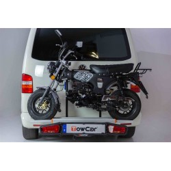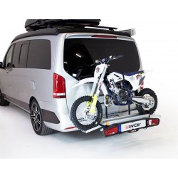 Racing motorbike carrier. Ideal for transporting mini-motorbikes, mopeds, trial bikes, or any type of light 2-wheelers. Mounts on the ball hitch, max load 75Kg, compatible with 7 or 13 pin plugs, anti-theft on the hitch head. Delivered with access ramp, but without the slant wheel adapter. Check the compatibility of the hitch mounted on your car, it will dictate the maximum acceptable weight.