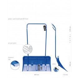 Pousse neige avec bac en plastique sur roulette très résistant, lame en alu, manche en métal. 80 cm de large. Avec sa poignée ergonomique et ses roulettes, il permet de déplacer un volume de neige important sans trop d'effort.