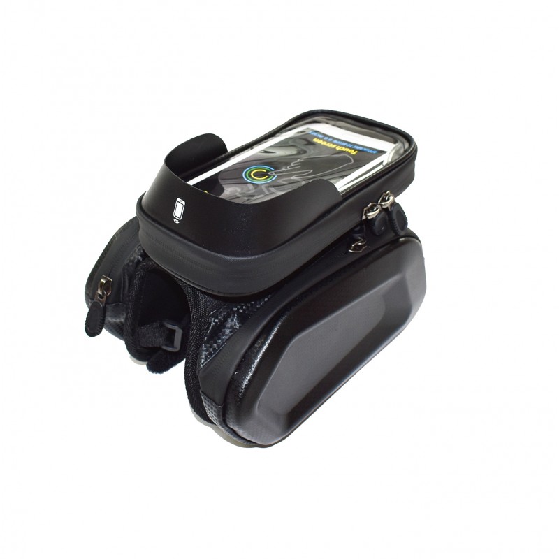 Sacoches de vélo avec support smatphone - fixation au cadre du vélo via 3 velcros - 2 compartiments latéraux et 1 support de smartphone amovible - Support de smartphone avec pare soleil et passe cable pour le chargement ou les écouteurs, compatible avec des téléphones de 6.0'' max (15 cm).