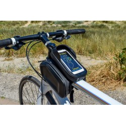 Sacoches de vélo avec support smatphone - fixation au cadre du vélo via 3 velcros - 2 compartiments latéraux, 1 poche pour documents et 1 support de smartphone amovible - Support de smartphone avec pare soleil et passe cable pour le chargement ou les écouteurs, compatible avec des téléphones de 6.0'' max (15 cm)