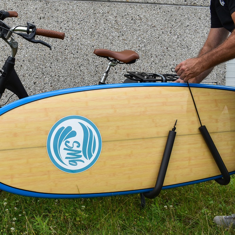 Porte surfboard pour 2 roues, il se monte sur le porte-bagages de votre vélo ou scooter. Montage simple avec des vis fournies. Bras en aluminium léger, élastiques pour sécuriser le surfboard. Adaptez votre conduite aux conditions de circulation et de prise au vent de votre surfboard, à utiliser pour des petits parcours, ne pas rouler à plus de 25km/h.
