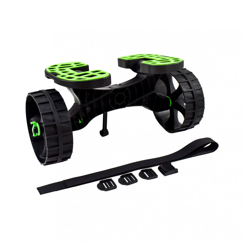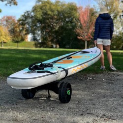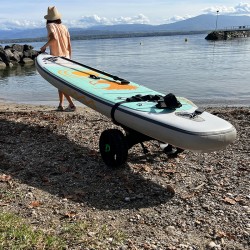 Chariot de transport pour SUP, Kayak, windsurf, boards…les deux supports rotatifs permettent d’adapter le chariot à la forme du board, de plus ils sont en caoutchouc antidérapants.Le châssis renforcé est très solide (charge jusqu’à 75Kg), les roues sont amovibles et le profil permet d’évoluer sur tous les terrains dont le sable. Il est équipé d’une béquille pour maintenir le chariot horizontal au moment de la charge. Complètement en plastique, il ne demande aucun entretien et résiste à l’eau de mer.