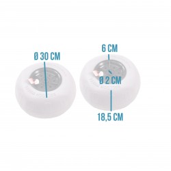 Diamètre :30cmLargeur : 18.5cm Axe : 2cm Hauteur du pneu : 6cmCapacité : 55 kg Pression : 2 à 4 psi