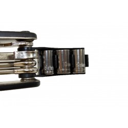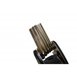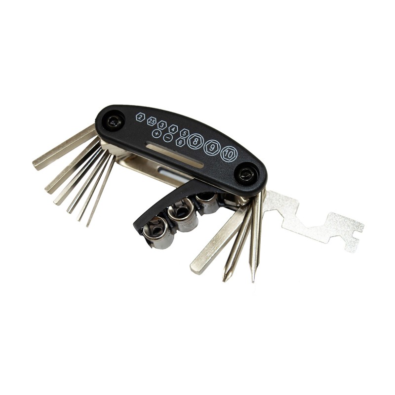 Lo strumento multifunzione perfetto per effettuare regolazioni o riparazioni durante l'uscita in bicicletta, è composto da 16 strumenti in 1, compatto e molto leggero. Questo strumento vi seguirà durante le vostre uscite in bicicletta senza ingombrarvi: Chiave a bussola - Bussole 8/9/10mm - Chiave a brugola 2/2.5/3/4/5/6 - Cacciavite piatto e cruciforme - Chiave HEX 8/10/15/mm