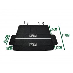 Coprisedile posteriore per cani. Larghezza 135 x lunghezza 117 cm. Protegge il sedile da sporco, graffi e umidità. Con alette laterali e 2 guinzagli per cinture di sicurezza in dotazione. Imbottito per un comfort ottimale. Facile installazione grazie alle cinghie con fibbia, ancorate al retro del sedile. Facile da pulire. Può essere adattato per un cane e un passeggero posteriore. Può essere utilizzato anche per trasportare i bambini! Sicuro, inodore e innocuo.