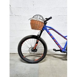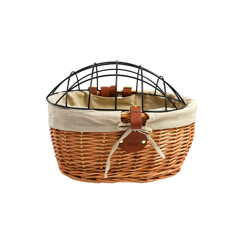 Cestino anteriore per bicicletta con griglia di sicurezza a strappo. Cinghie in pelle per il fissaggio al manubrio della bicicletta. Vero vimini. Tessuto protettivo in lino. Per il trasporto di cani o gatti di piccola taglia. Sicuro, inodore, resistente e non nocivo. Dimensioni del cestino: larghezza 40 x lunghezza 30 x altezza 30 cm. Materiali: vimini, acciaio, pelle.