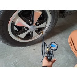 Pistola di gonfiaggio digitale con indicatore di pressione, scelta tra 4 unità di misura della pressione (PSI, BAR, KG/CM², KPA). Tubo flessibile da 70 cm. Batterie AAA incluse.