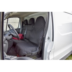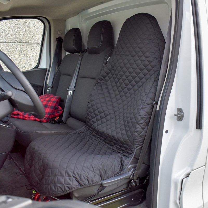 Zwarte gewatteerde stoelhoes. Gemakkelijk te installeren en comfortabel. Zeer praktisch om uw stoelen te beschermen, u plaatst deze hoes in enkele seconden op uw stoel. Compatibel met zij-airbags (zie lijst van voertuigen in de foto's).
