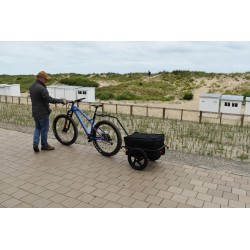 Deze vrachtkar is ideaal voor het vervoeren van diverse zware en volumineuze voorwerpen met uw fiets. Het kan ook worden gebruikt als transportmiddel voor uw boodschappen. Het stijve frame herbergt een kist en een waterdicht dekzeil om de inhoud van de aanhangwagen te beschermen.