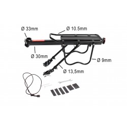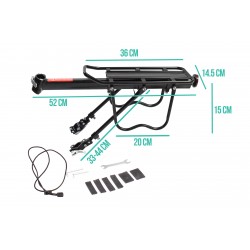 Bevestigingsdiameter voor zadelpen: MAX. 33 mmNutbare breedte: 14,5 cmNuttige lengte: 36 cmTotale lengte van de bagagedrager: 52 cmGewicht: 1,4 kgMAX. belasting: 50 kgMateriaal: AluminiumlegeringKleur: ZwartInclusief: Rubberen beschermwiggen en elastische touw (riem)REF Fabrikant: 6288