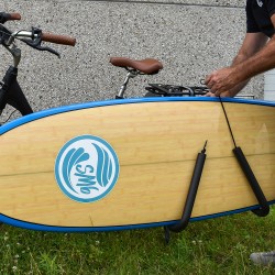 Surfboardhouder voor 2 wielen, deze wordt gemonteerd op de bagagedrager van je fiets of scooter. Eenvoudige montage met meegeleverde schroeven. Lichtgewicht aluminium armen, elastiek om het surfboard te beveiligen. Pas je rijgedrag aan de verkeers- en windcondities van je surfboard aan, te gebruiken voor korte parcoursen, rijd niet meer dan 25 km/u.